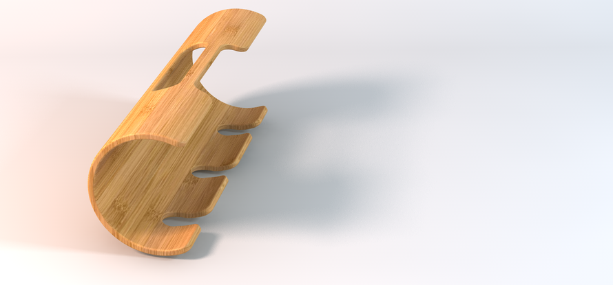 des Flaschträgers wurde nochmals Material reduziert und eine größere Fläche aus dem Bambusrohr geschnitten. Die Flaschenhälse werden seitlich in die drei unteren Öffnungen gedrückt und können transportiert werden.