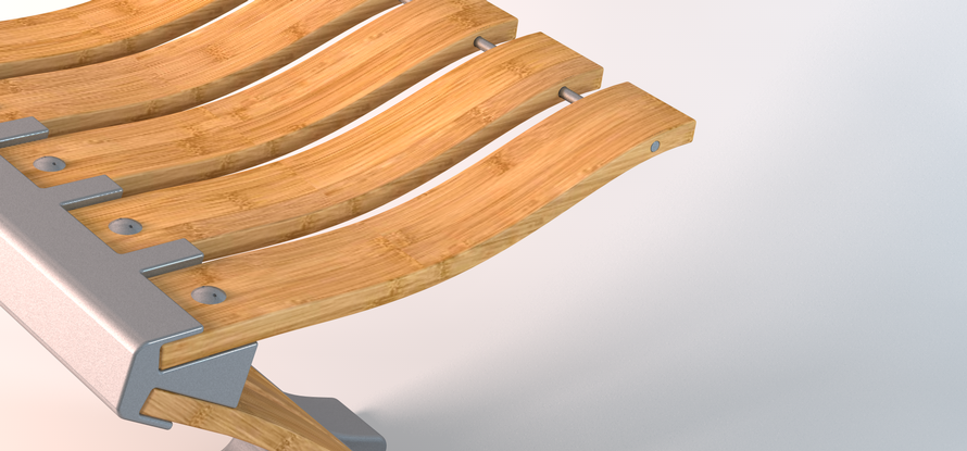 Die oberen Bambusbretter sind einzeln in das hinten liegende Verbindungselement eingelegt und verschraubt. Damit sich die Sitzfläche nicht unkontrolliert bewegen kann, ist vorne eine Querstange eingelassen.