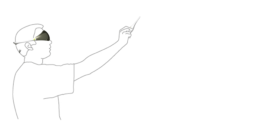 ist es, den Stift, mit dem dünnen Ende nach oben gerichtet, wie einen Dirigentenstab durch die Luft zu führen um damit z.B. filigrane Konturen von Bauwerken oder der Natur nachzuzeichnen. Dabei sendet die kleine LED am Ende des Stiftes permanent ein Leuchtsignal, welches von der Brillenkamera getrackt und auf dem Brillenglas vorm Auge digital abgebildet wird.