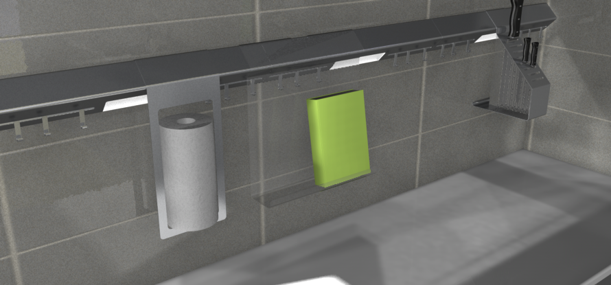 In diesem Küchenbereich befinden sich das Küchenrollenmodul und der Buchhalter. Das Rollenmodul ist wieder aus gebogenem Blech, der Buchhalter diesmal aus transparentem Kunststoff. Der Buchhalter soll dem Koch auf Augenhöhe das Zubereiten erleichtern und zudem in sicherer Höhe über den Zutaten hängen.