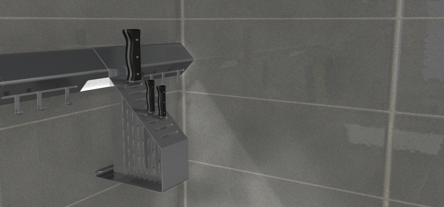 Eine der wichtigsten Werkzeuge in der Küche sind scharfe Messer. Dafür gibt es natürlich auch ein entsprechendes Modul. Dieses besteht aus einem Edelstahlband, welches sich formal schlüssig um einen inneren Acrylblock legt. Der Acrylblock bietet neben einer edlen Anmutung auch den nötigen Schutz vor den scharfen Messerklingen.