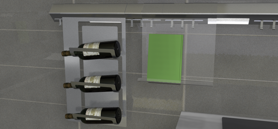 Hier sind, im flach nach unten hängenden Blech, jeweils drei Bögen ausgeschnitten, welche anschließend definiert nach unten gebogen werden und somit die Flaschen „tragen“.