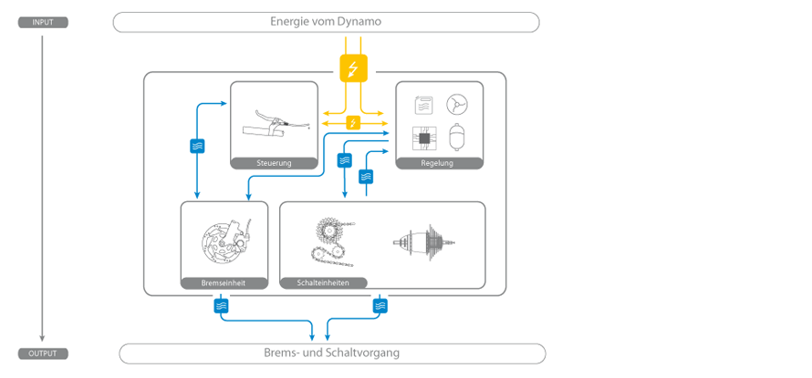 Durch den Nabendynamo wird bei der Fahrt permanent elektrische Energie zur Verfügung gestellt, welche wiederum zum Antrieb einer kleinen Hydraulikpumpe verwendet wird. Diese Pumpe füllt einen Membranspeicher mit einer entsprechenden Hydraulikflüssigkeit, so dass dieser die in ihm gespeicherte „Kompressionsenergie“ bei Bedarf wieder freisetzen kann. Dies geschieht zum Beispiel dann, wenn der Benutzer am Griff ein „Knöpfchen“ drückt und somit einen elektrischen Impuls an die Regelungseinheit schickt, die dann die Hydraulik aktiviert und den Schaltvorgang auslöst. Die Bremseinheit kann optional auch mit dem Hydrauliksystem verbunden werden, um eine bremskraftverstärkende Wirkung zu erzielen.